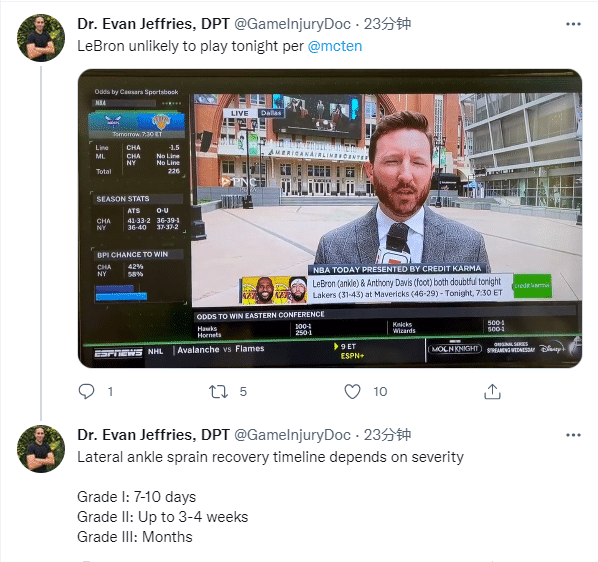 詹姆斯不幸扭伤左脚踝导致脚踝肿胀,昨天没有参加球队训练,今天继续接受全天候治疗,无奈如此伤病确实无法上场;詹姆斯的脚踝伤势令人担忧,医学专家Evan Jeffries表示詹姆斯的康复期与受伤程度有关,最轻一级扭伤需要休息7-10天,最重三级扭伤需要伤停几个月。