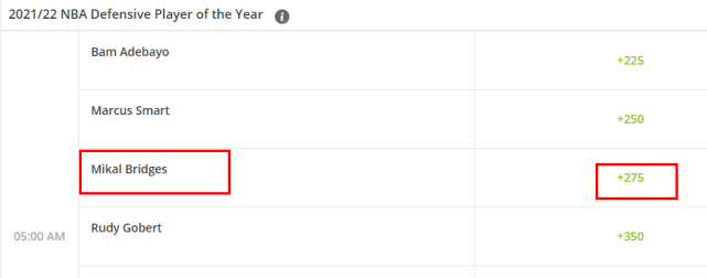 最新的赔率显示,最佳防守球员奖的竞争非常激烈,有四位球员都有可能拿到这一奖项,依赔率排名依次是阿德巴约(+225)、斯马特(+250)、布里奇斯(+275)和戈贝尔(+350)。不少人支持布里奇斯拿到这个奖项,这位进入NBA以来就没休战过的铁人,正赢得越来越多的认可。