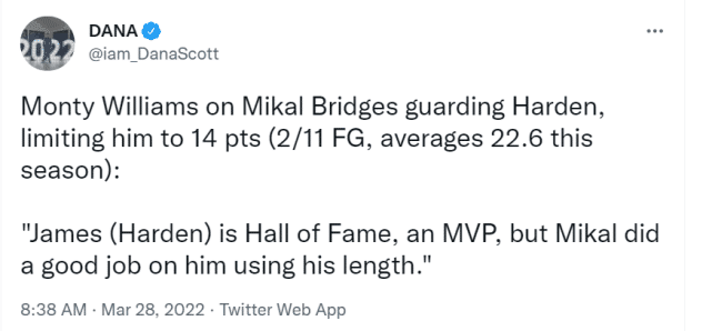 最大的功劳要记在布里奇斯身上,因为他是主防哈登的那个人,是他打乱了哈登的进攻节奏。赛后,蒙蒂谈到布里奇斯对哈登的防守时说:“詹姆斯(哈登)是一个名人堂球员,一个MVP,但米卡尔(布里奇斯)利用身材优势防他防得很不错。”