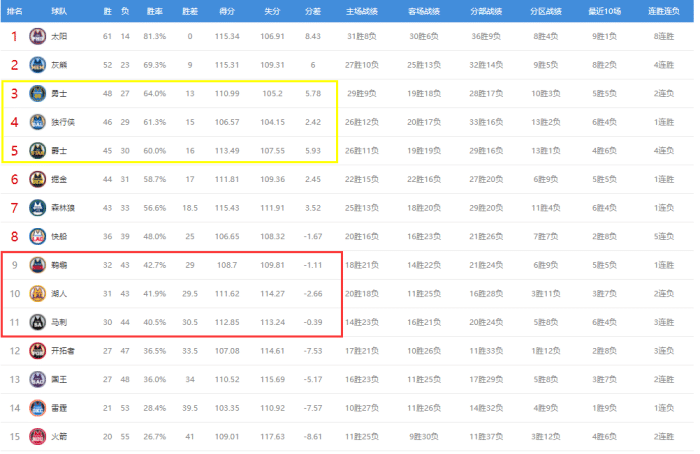 西部方面,榜首太阳高歌猛进大胜费城,灰熊稳居第二。勇士115-123不敌奇才,由于独行侠114-100击败爵士,独行侠已经超越爵士,升至第4,而且距离勇士只有2个胜场。掘金排名第6,森林狼惨败依然排名第7,快船则稳居第8。