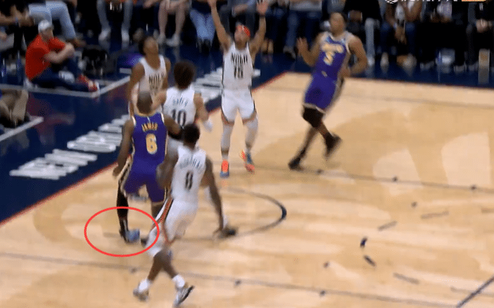 詹姆斯受伤一幕曝光,第二节10分多钟,詹姆斯冲到禁区准备抢篮板,不慎踩到海斯的脚,导致左脚踝呈90度崴伤,老詹痛苦倒地不起,鹈鹕5打4反击,之后湖人暂停,詹姆斯躺在地板上换了一会,之后起身重新绑紧鞋带,在场上走了几圈,然后坐回替补席,又重新绑紧鞋带,继续上场打比赛。