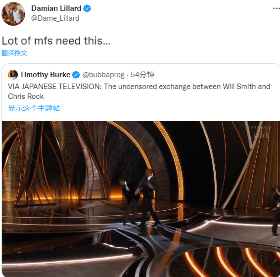 黄蜂球员布里奇斯发推:为什么我在比赛结束后看到的第一件事就是威尔-史密斯掌掴主持人;小托马斯转发视频并发推:我的天呐,真给了他一巴掌。