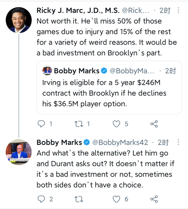 马克斯回复了这位球迷:“还有什么选择吗?让他走然后杜兰特申请离开篮网?是不是糟糕的投资并不重要,有时候,双方都别无选择。”马克斯的意思很明白,篮网为了杜兰特只能留下欧文,而欧文除了留在篮网,还有其他球队敢冒险要他吗?