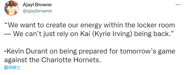谈到明天主场对阵黄蜂,欧文迎来赛季主场首秀,杜兰特表示:我们需要在更衣室里创造自己的能量,我们不能仅仅依靠欧文的归来;纳什希望能得到更多主场球迷的支持,相信明天的巴克莱中心球馆,一定会很火爆。