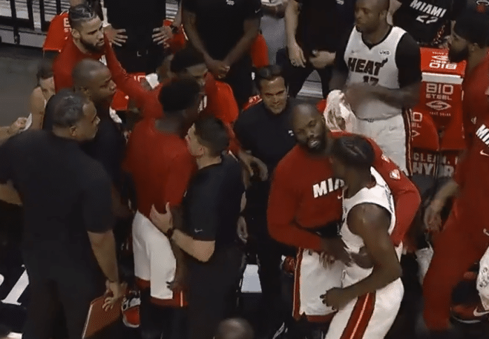 热火打得不顺,场边的热火主帅斯波和哈斯勒姆与巴特勒发生了冲突,斯波更是十分愤怒的怒摔战术板,好在是队友及时拉开了,塔克抛投命中,阿德巴约篮下暴扣得手,勇士请求暂停,勇士疯狂攻击波过后,球队手感稍有下降,洛瑞三分投射命中,邓罗超远三分投射也中,阿德巴约暴扣得手,塔克篮下打中并且造成了普尔的犯规,阿德巴约这一点连续得分,洛瑞三分命中后,两队各打了半节好球,三节比赛打完,勇士领先1分。