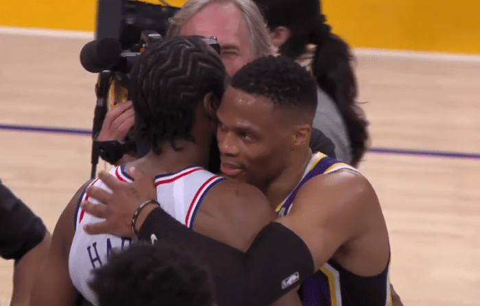 赛后拥抱哈登!威少超越名宿破纪录,惜败后与登哥寒暄满脸笑容