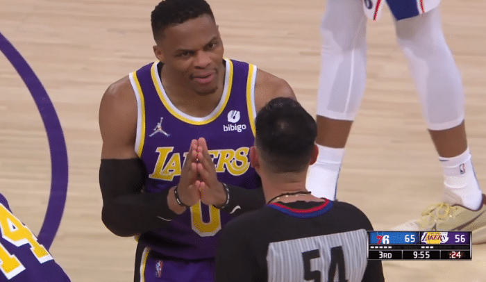 下半场,湖人第三节一直落后10分左右,威少突破哈登并且晃飞恩比德上篮得分,之后因不满判罚而怒吼抱怨吃到技术犯规;威少再次失误,传球直接被哈登抢断,所幸里夫斯成功反抢;随后威少终于命中三分球,第三节最后1分53秒,威少上场再次命中三分。