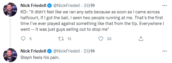 杜兰特还表示他在比赛中问独行侠是不是只会包夹,但这样的激将法并没有凑效。