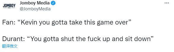 比赛期间,杜兰特和主场球迷激情互喷一幕曝光,当时球迷大喊凯文,你必须接管这场比赛;杜兰特强势回应:你TM给我闭嘴坐好。