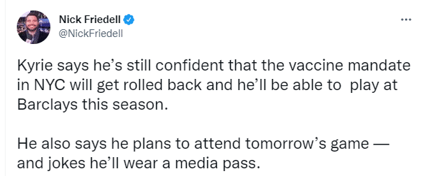 欧文还说他仍然相信纽约市的疫苗规定将被取消,他本赛季将能够在巴克莱中心打球。