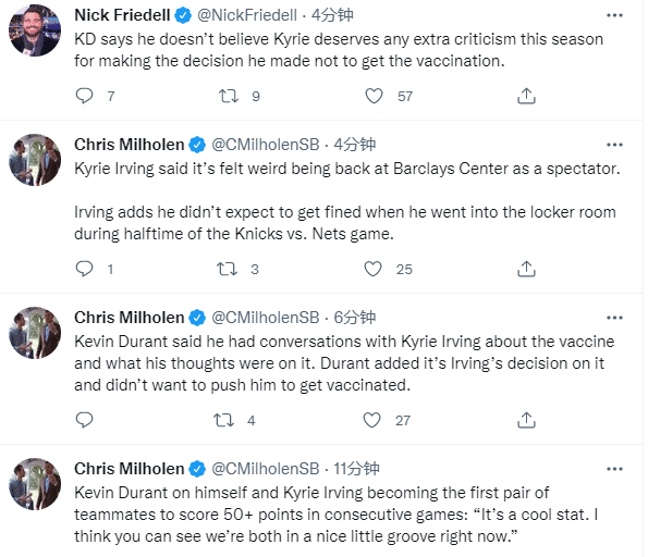 赛后谈到和欧文一起创造历史第一纪录(历史第一对连续两场50+的队友),杜兰特表示:这是一个很酷的数据。我想你可以看到我们现在都处于一个很不错的状态之中;