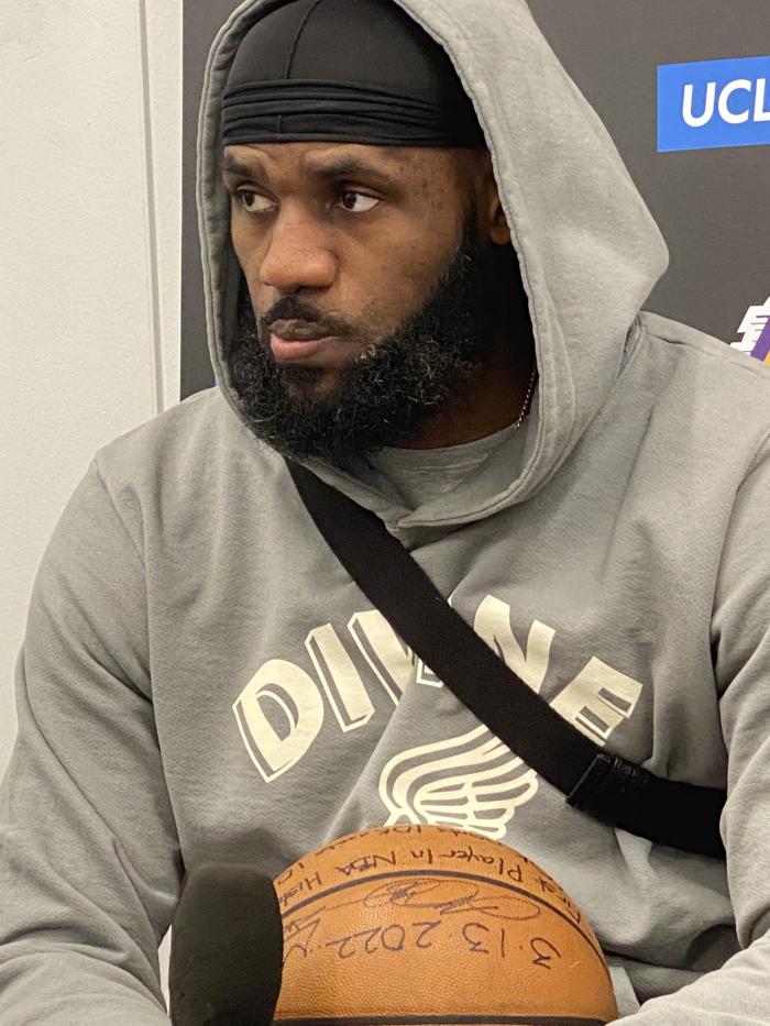 詹姆斯坐在更衣室,双膝包裹着厚厚地冰袋,背部也在冰敷;打造签名球时十分认真,一边看手机一边写字,在纪念球上写上10000分、10000助攻、10000篮板以及2022年3月13日等字样,最终签名并且画上王冠的表情,完工之后老詹冲着篮球吹气,然后双手抱球并且冲着镜头大笑。