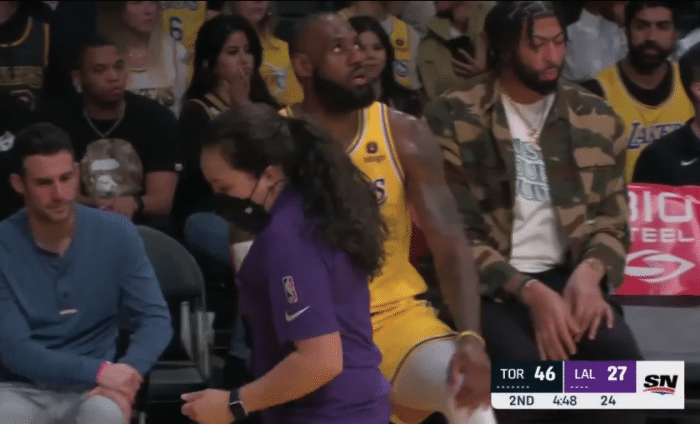 第二节,猛龙进攻火力明显下滑,湖人进攻反弹,外线三分连续16投不中后,塔克为湖人命中本场第一记三分,之后湖人又连续命中两记三分,不过第二节4分48秒,湖人丢掉防守篮板,此时詹姆斯突然怒了,拿球连续三次怒砸地板,沮丧之情全都写在脸上。