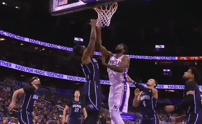 尼昂抛投得手,哈登造犯规两罚一中,比赛进入暂停,安东尼三分不中,哈登再造犯规两罚全中,卡特强打恩比德得手,恩比德造犯规上罚球线,哈登三分投射不中,半场比赛打完魔术59:47领先76人12分。上半场的比赛哈登8投1中,0次助攻,恩比德15投4中得到了12分。