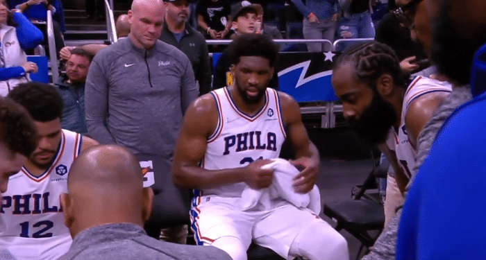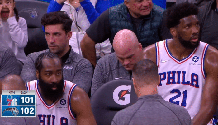 下半场,恩比德第三节大爆发,单节轰下13分带队缩小分差,而哈登3投1中仍旧表现一般,不过外线三分球终于开张;末节哈登疯狂造犯规,第四节还剩7分钟,暂停时哈登与小乔丹进行了一番交流;关键时刻,哈登再次命中三分,生死时刻,哈登突破上篮不进,马克西错失绝杀。