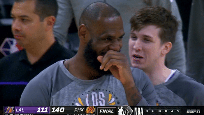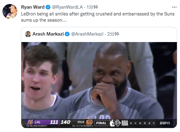 湖人记者Ryan Ward发推写道:勒布朗在被太阳队压垮后尴尬地露出满脸笑容,这总结了湖人的这个赛季;有球迷说当湖人输将近30分而詹姆斯拿到30分时,他笑了。