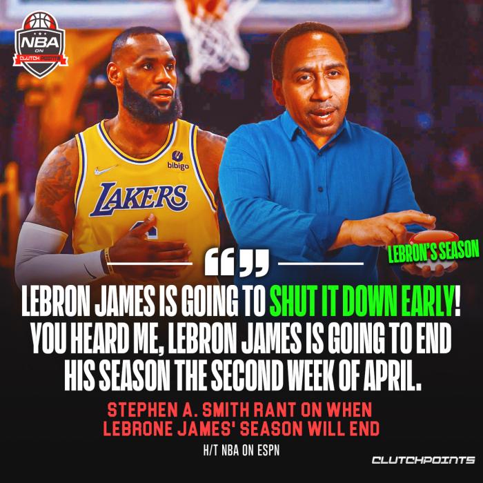 距离常规赛结束还剩下不到一个月,湖人还有希望杀进季后赛吗?名嘴“美国杨毅”斯蒂芬-A-史密斯完全不看好湖人和詹姆斯,史密斯在节目中表示:詹姆斯将提前结束他的赛季,你听我说,他将在四月的第二周结束他的赛季。
