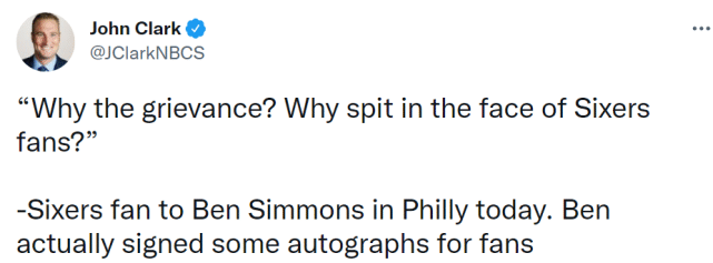 至于第二段视频,是西蒙斯和队友们返回所住的费城四季酒店的画面。很多球迷已经等待在酒店门口,想要得到西蒙斯的签名。西蒙斯心情也不错,走下车后签了一两个,但也没有全部满足所有球迷,毕竟人数不少,保安维持着现场的秩序。一些球迷高喊:“为什么申诉?为什么当着76人球迷的面吐口水?你不知道曾在这呆了5年吗?”西蒙斯没有任何回应,拍着球走进了酒店。