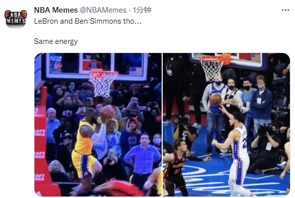 美媒NBA Memes晒出了詹姆斯曾经对JR使用的经典图片调侃:“这就是安东尼接到詹姆斯反篮不上选择传球后的反应;美媒还调侃詹姆斯放弃上篮与去年西蒙斯季后赛放弃上空篮是相同的。