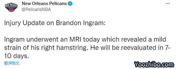 上一场鹈鹕不敌灰熊,英格拉姆因伤休战,经过核磁检查之后,他的伤情确诊为腿筋轻微拉伤。