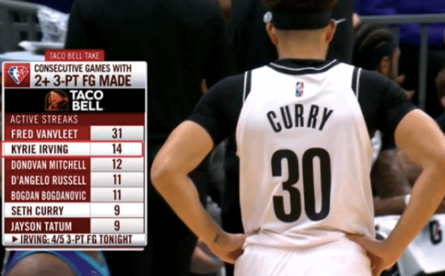 5.欧文连续14场比赛至少命中2记三分,在本赛季现有纪录里排名第二,位居第一的是范弗利特的连续3纪纪录