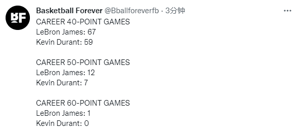 美媒Basketball Forever列出詹姆斯和杜兰特生涯三种单场得分对比,詹姆斯40+、50+和60+次数都完胜杜兰特,而KD生涯至今单场得分从未突破60+。