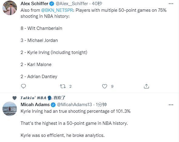 欧文投篮命中率79%、三分命中率75%和罚球命中率84.6%,本场比赛真实命中率高达101.3%,成为历史单场50+真实命中率最高的球员,该纪录历史第一人;欧文也并列成为历史第三位多次投篮命中率75%且50+的球员,比肩张伯伦(8次)和乔丹(3次)。
