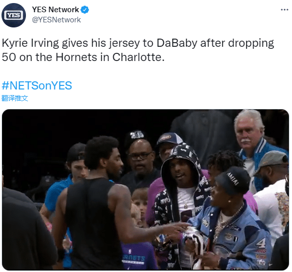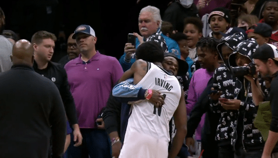 杜兰特和欧文一起离场,离场前欧文拥抱场边的说唱歌手DaBaby,并且把本场比赛的球衣送给他,欧文穿着黑色背心返回更衣室。