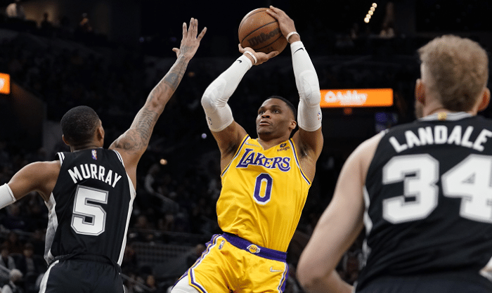 第四节,威少突破进去之后上篮不中,不过他积极补篮得分。当马刺打出一波11-2的阶段,威少抢断约翰逊,随后他还助攻塔克命中三分球。威少摘下前场篮板,他出手被犯规,两罚中一,帮助湖人追分。威少上篮和三分球都没有打进,湖人再度被马刺拉开了比分差距。镜头给到詹姆斯,詹皇脸色铁青,这样湖人遗憾输球,不敌马刺。