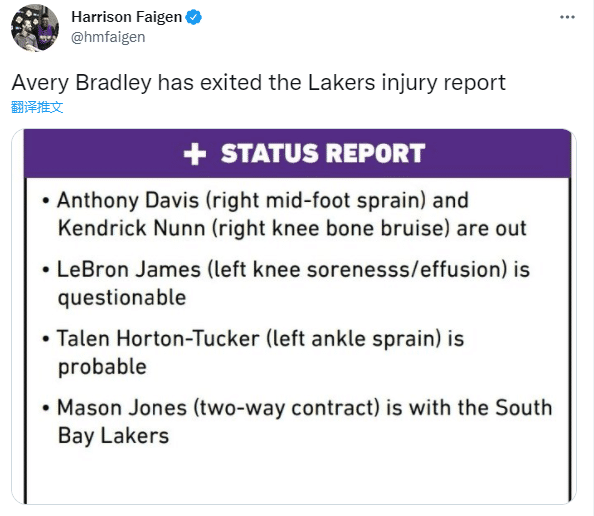 湖人官方已经宣布下一场对阵马刺的伤病报告,浓眉(中足扭伤)和纳恩(右膝骨挫伤)因伤继续休战,詹姆斯(左膝酸痛)出战成疑,霍顿-塔克大概率出战,布拉德利已经不在伤病名单上。