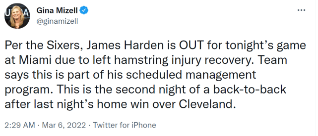 76人今日客场挑战热火,哈登将缺席这场背靠背的比赛。官方表示,哈登因为腿筋伤病管理缺席本场比赛,这是关于哈登腿筋恢复计划的一部分。哈登已经为76人出战4场比赛,76人全部取胜。哈登场均贡献26.8分7.5篮板12助攻。76人目前39胜23负,排名东部第二。
