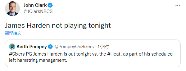 到目前为止,76人39胜23负排名东部第二,仅落后东部第一的热火2个胜场;根据赛程,哈登今天因伤休战,76人将在今天上午9点背靠背对阵热火,东部第一的关键争夺战。