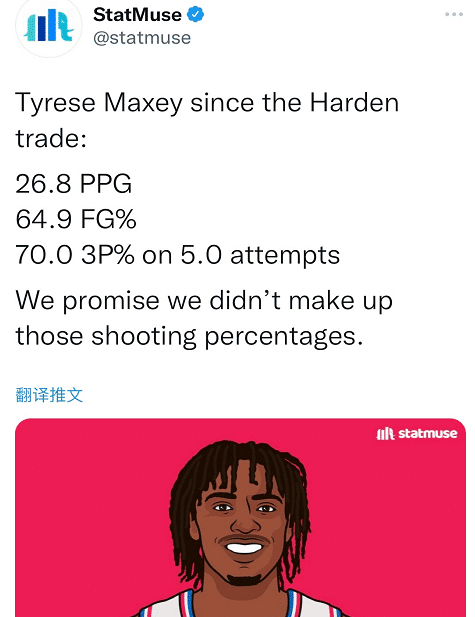 还有一点是很重要的,那就是哈登带动队友,尤其是马克西,毕竟哈登是联盟最顶级的助攻手,在哈登加盟后,马克西场均可以得到26.8分,投篮命中率64.9%,三分命中率高达70%,这位小将彻底爆发。