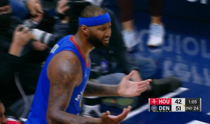 不过考辛斯上半场吃到3次犯规,摊手不满判罚仍没用,半场还剩1分多钟,他无奈下场坐回替补席。