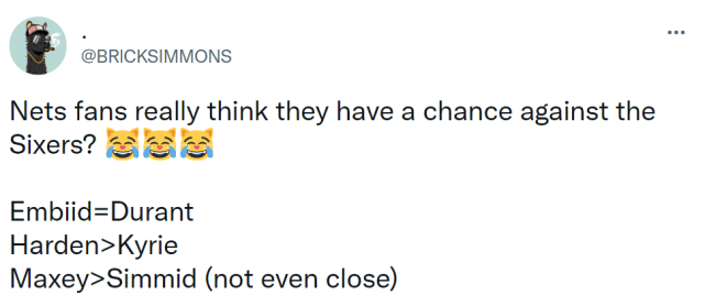 当然,除非在总决赛相遇,否则76人和湖人是不会在季后赛碰面的。球迷们提及费城的“马大哈”组合,首选的比较对象还是篮网的新三叉戟。由于西蒙斯还没有迎来篮网生涯首秀,所以数据方面无法比较,但球迷们的讨论早已经开始。