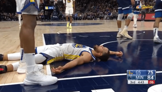 下半场,库里开启杀神模式,外线造犯规三罚全中,反击中突然干拔大号三分,强硬上篮被撞倒却没哨,库里坐在地板上表不满,之后库里反击上篮,外线三分再中,杀到内线抛投打成2+1,急停中投也有,单节独砍16分;库里躺在地板上休息太有趣,一波操作下来,可能真累了。