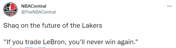 谈到湖人的未来,奥尼尔表示:如果你交易勒布朗,以后你将再也无法赢得总冠军;奥尼尔还表示,如果你能在詹姆斯身边配上正确的球员,他们肯定能赢得总冠军,我认为无论是谁组建了团队,他都需要站出来,努力解决这个问题。