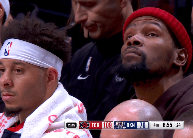 来源:24直播网03-01 15:0424直播网03月01日讯 ,杜兰特戴着小红帽坐在替补席观战,看到球队被打爆,KD一脸失落和无奈;输球后篮网32胜30负继续排名东部第八,领先黄蜂2个胜场,落后猛龙(33胜27负)2个胜场;明天篮网将在多伦多再战猛龙,杜兰特因伤继续休整,欧文和西蒙斯也无法出战。