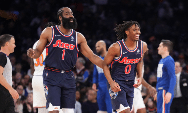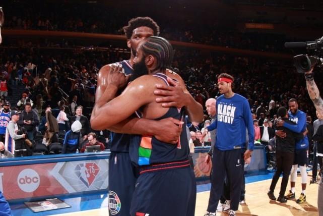 76人客场125-109击败尼克斯。哈登迎来76人生涯第二战,贡献29分10篮板16助攻,恩比德轰下37分9篮板4盖帽,马克西21分7篮板。继上一场比赛合砍89分后,本场三人又合砍87分,费城的“马大哈”组合两场比赛狂轰176分,火力实在太猛了!赛后,哈登和恩比德拥抱庆祝胜利!