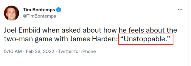 赛后,恩比德谈到搭档哈登的感受时,豪言“不可阻挡”。谈到与恩比德并肩作战,哈登也表示:“我真的感觉很舒服,只要我们继续沟通交流,一切都会变得非常棒!”