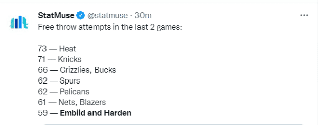 此前有媒体预测,哈登的加入会让恩比德的数据有所下滑,可事实并非如此。哈登让恩比德打得更轻松了,对方很难组织有效的防守,只能频频通过犯规去阻挡,这也让恩比德本场比赛一共获得27次罚球机会,并罚中23球。单场27次罚球也创造了本赛季的联盟纪录。