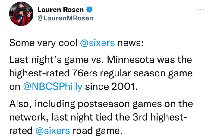 除了赛场上,因为哈登的到来,76人也赚翻了。哈登在76人的第一场比赛收视率就创造了纪录,哈登的首秀创造了当地电视转播机构自2001年来的最高收视率纪录,也是76人队史第三大收视率纪录。从这点就可以看出,外界对于哈登和恩比德的期待值有多高,而如今两人联手,保持全胜。