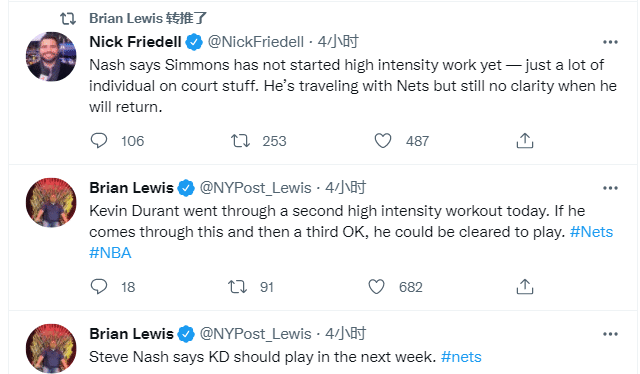 纳什表示杜兰特将在下周复出,但没有确定具体哪一天复出;《纽约邮报》记者Brian Lewis报道,杜兰特只要再来一次高强度训练,他就可以迎来复出:杜兰特在今日进行了第二次高强度训练,如果他能熬过这一关,然后再进行第三次高强度训练,他就可以出场了。