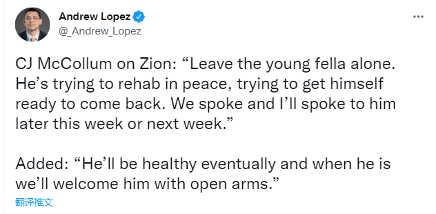 来源:24直播网02-25 15:3324直播网02月25日讯 ,鹈鹕新援CJ-麦科勒姆谈到外界对锡安的批评,他表示:别再影响这个年轻人了。他正在尝试平静地康复,试图让自己做好回归的准备。我们谈过了,我将在本周晚些时候或下周和他谈;他最终会健康的,当他健康的时候,我们会张开双臂欢迎他。