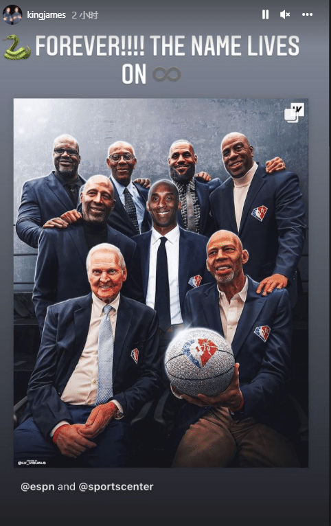 科比C位!詹姆斯转发75大球星湖人版合照:曼巴永恒,名字永远传承