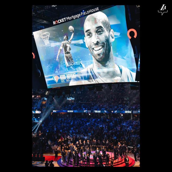 在今年湖人球星合影留念时,众人特意为科比留了一个位置,当时杰里-韦斯特指着把C位留给科比;而在75大球星登台亮相时,现场大屏幕放出科比的生卒年以及身穿科比8号球衣扣篮和满脸笑容的旧照,众星抬头看向大屏幕。