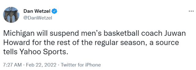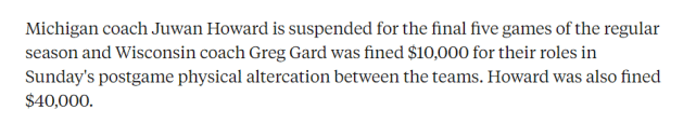 据名记Dan Wetzel报道,密歇根大学将禁止主教练朱旺-霍华德执教本赛季余下的常规赛。密歇根大学还剩5场常规赛,这意味着他将被禁止执教5场球。49岁的霍华德被禁赛的原因,在于昨天对威斯康辛大学的一场比赛中,他猛扇对手助教克拉本霍夫特,引发了一场大冲突。霍华德还被罚了4万美元,威斯康辛大学主帅加德被罚1万美元。目前,霍华德已经公开道歉,并特别向克拉本霍夫特致歉。