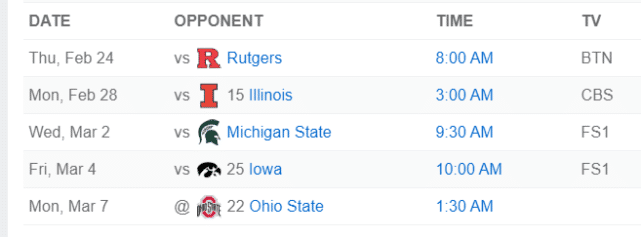 密歇根大学目前的战绩是14胜11负,排名Big Ten联盟的第7位。他们还剩5场常规赛,对手依次是罗格斯大学、伊利诺伊大学、密歇根州大、爱荷华大学和俄亥俄州大。
