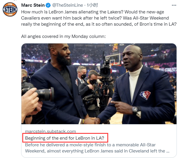 24直播网02月22日讯 ,克利夫兰全明星周末已经结束了,但关于詹姆斯可能离开湖人的争议言论依旧在;名记Marc Stein撰文并发推写道:勒布朗-詹姆斯在多大程度上疏远湖人?在他两次离开后,新时代骑士会想要他回来吗?全明星周末真的像人们经常听到的那样,是勒布朗湖人生涯终结的开始吗?