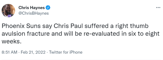 来源:24直播网02-21 19:0524直播网02月21日讯 ,据名记克里斯-海耶斯报道,太阳球星保罗遭遇右手拇指撕脱性骨折,预计6-8周后进行伤势重新评估。这意味着保罗将至少缺席6-8周的比赛,有可能常规赛报销。